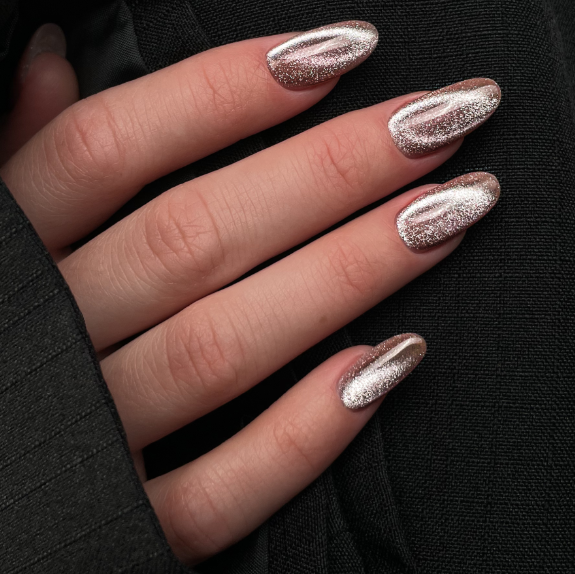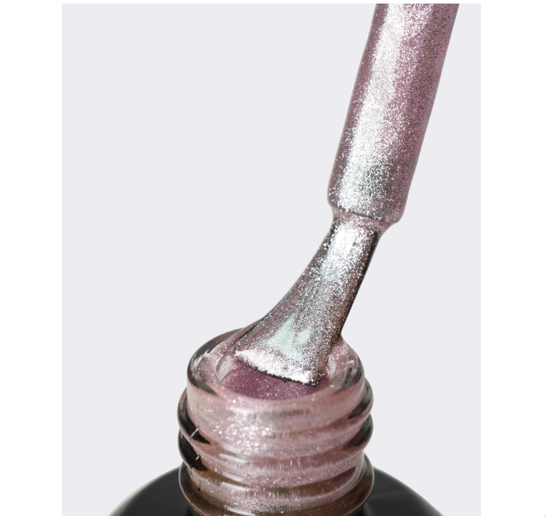 Высокая концентрация металлических частиц создает яркий блик днем и сверкает ночью при попадании искусственного света на ноготь.