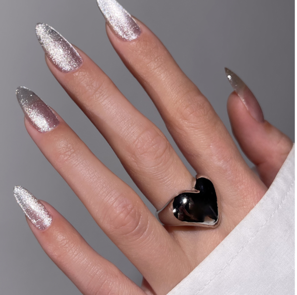Высокая концентрация металлических частиц создает яркий блик днем и сверкает ночью при попадании искусственного света на ноготь.