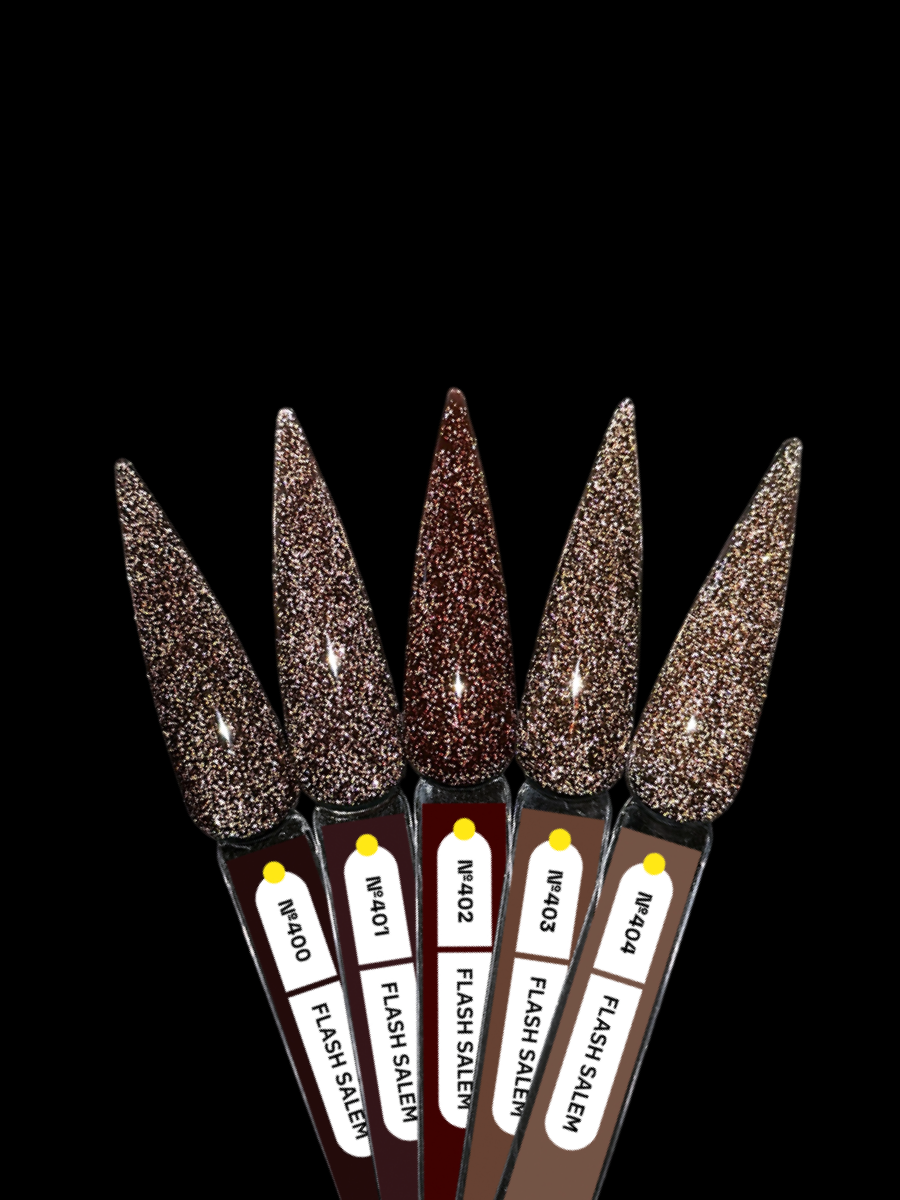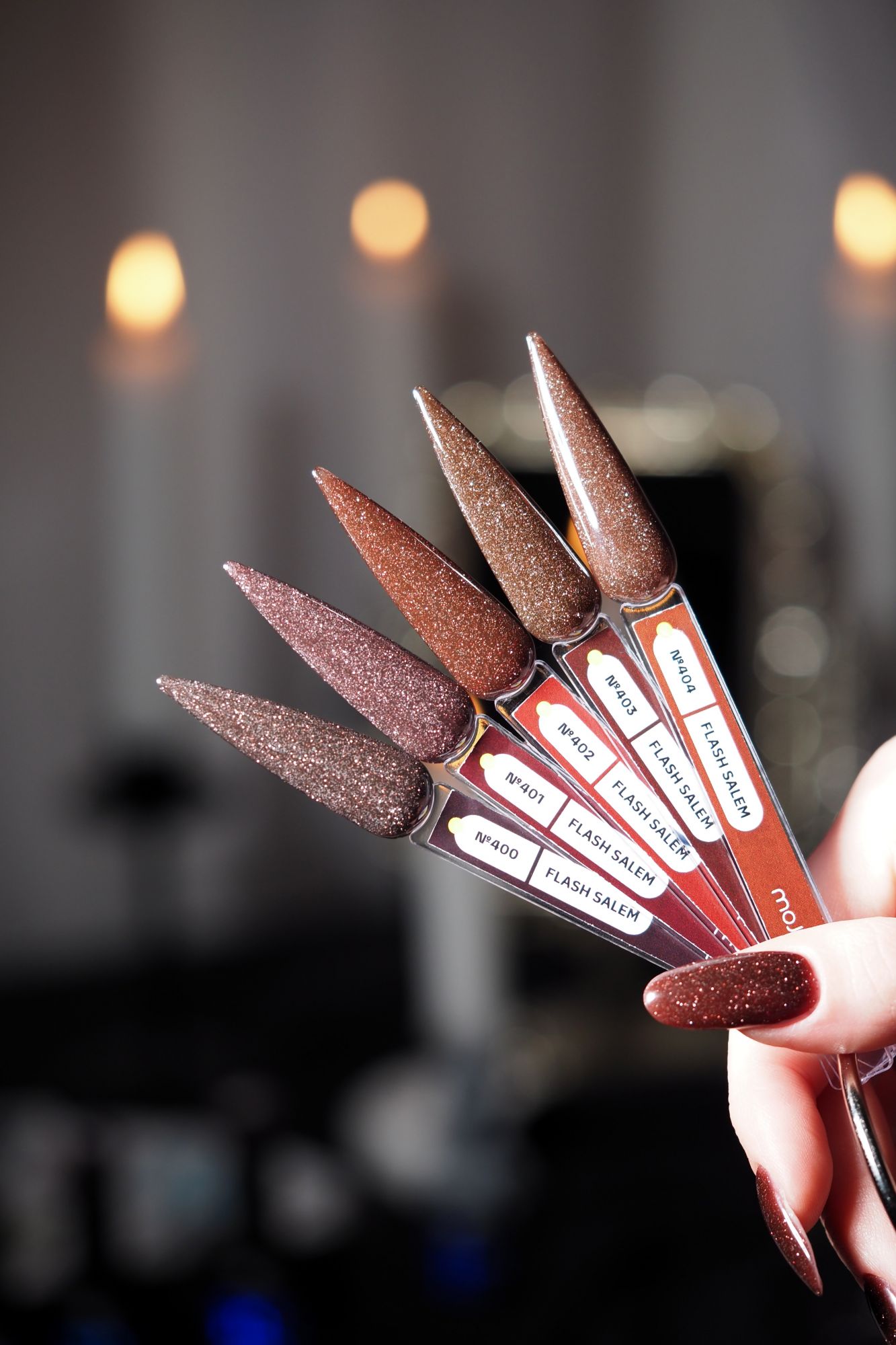 FLASH SALEM – это светоотражающие гель-лаки в темных коричневых оттенках. Вдохновленная мистикой салемских ведьм, коллекция придаст готический шарм любому образу. Выразительное темное покрытие при дневном свете, эффектное бриллиантовое свечение при искусственном.