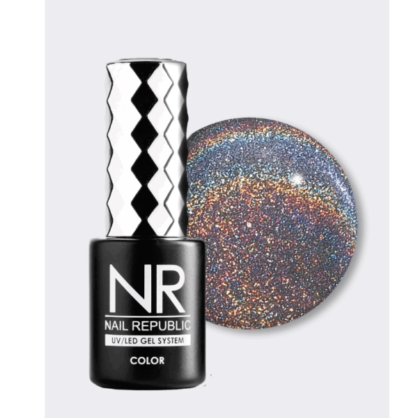 • На натуральных ногтях гель-лак слегка отливает сталью, перетекая в радужный эффект.