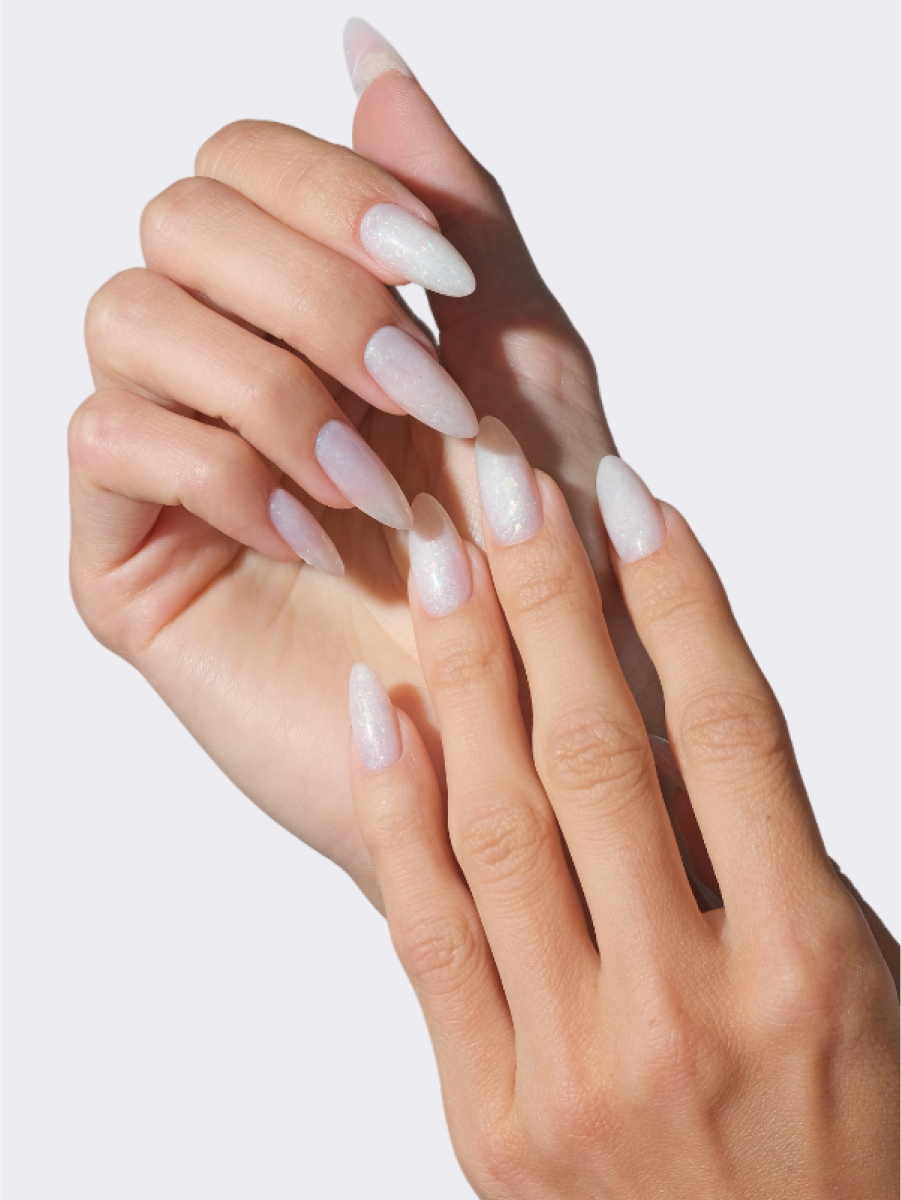 Тёплое мерцание в нежно-молочных оттенках придаёт дизайну эффект опала.
